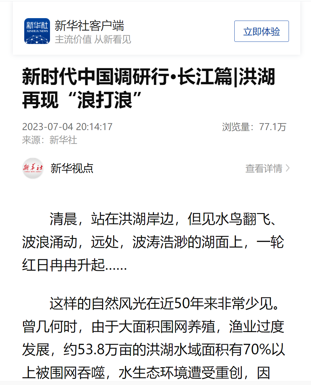7月4日,新华社发布《新时代中国调研行·长江篇|洪湖再现“浪打浪”》聚焦湖北洪湖生态保护工作。全文如下: