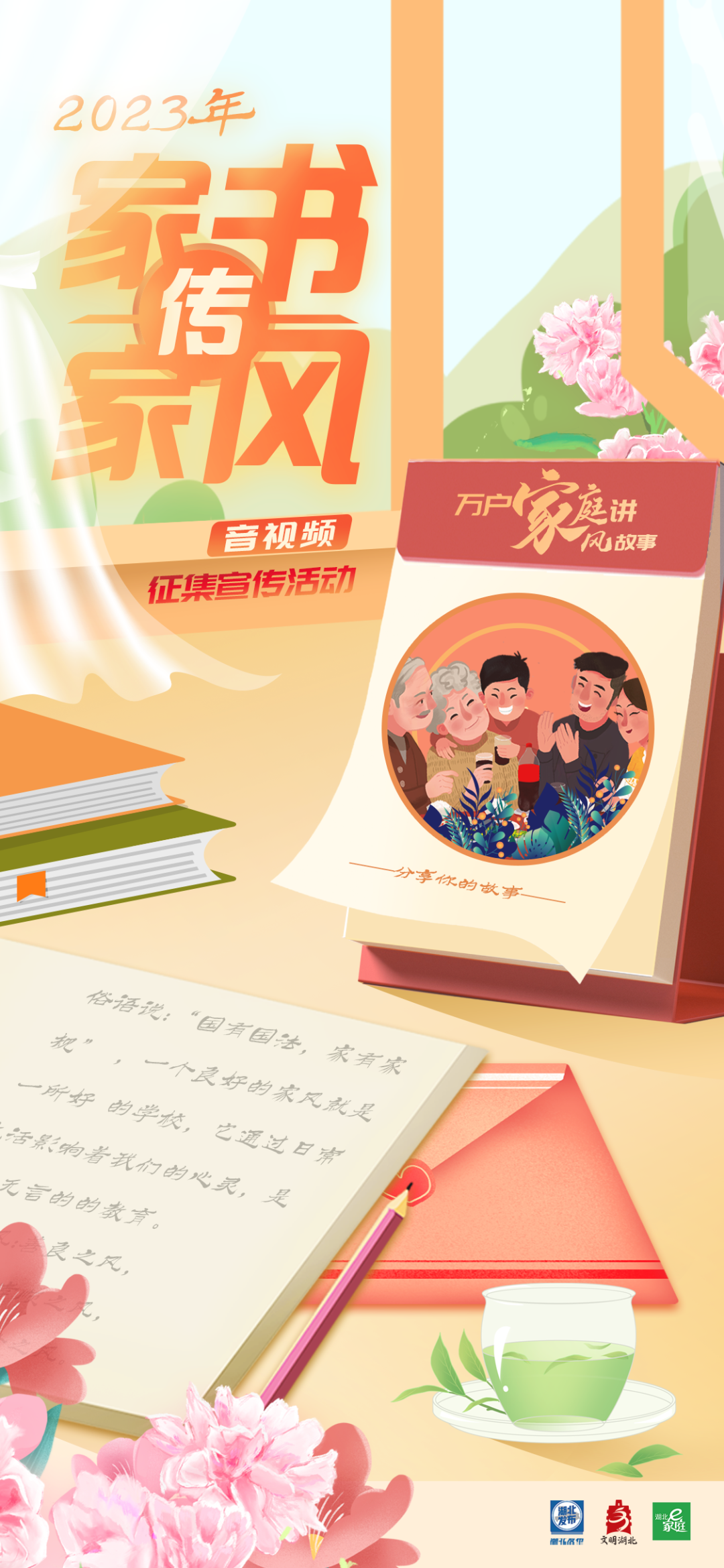 为深入学习贯彻习近平总书记关于家庭家教家风建设的系列重要论述,认真贯彻落实党的二十大报告关于“弘扬中华传统美德,加强家庭家教家风建设”的部署要求,号召全省家庭传承优良家风,创建文明家庭,为湖北加快建设全国构建新发展格局先行区贡献家庭力量。省文明办、省妇联开展了2023年“家书传家风”万户家庭讲家风故事音视频征集活动。