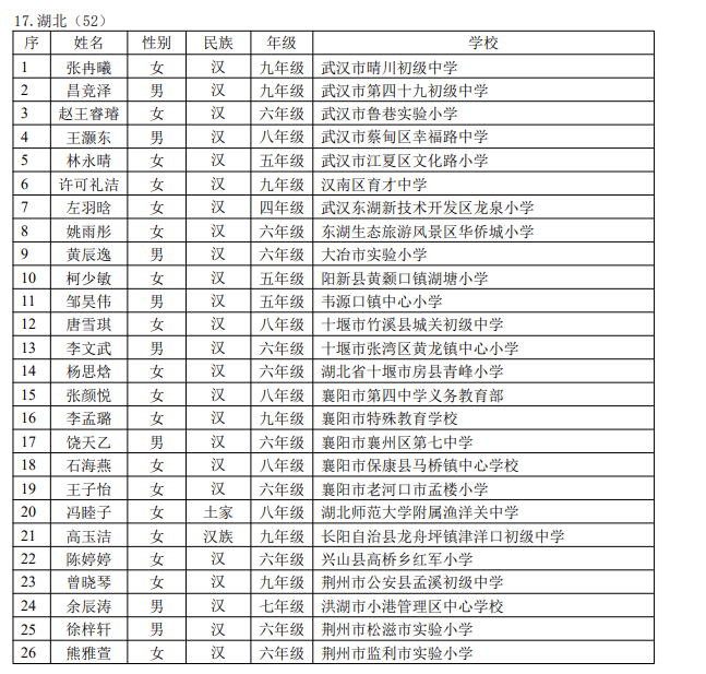 湖北入选52名