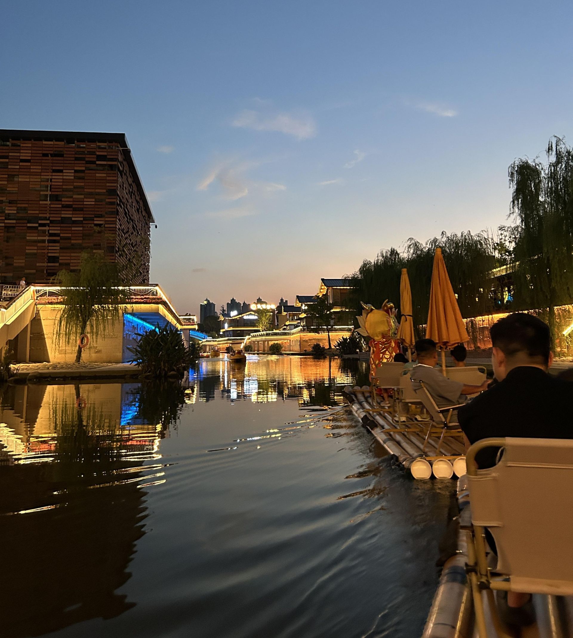 在襄水街里,水上乐园的清凉驱散了白日暑气,成了附近居民和小朋友们的欢乐天地,水花飞溅中满是欢声笑语。龙游襄水,竹筏缓缓划过水面,伴着绝美晚霞,吹拂着惬意晚风,感受着夜色里的宁静与浪漫。