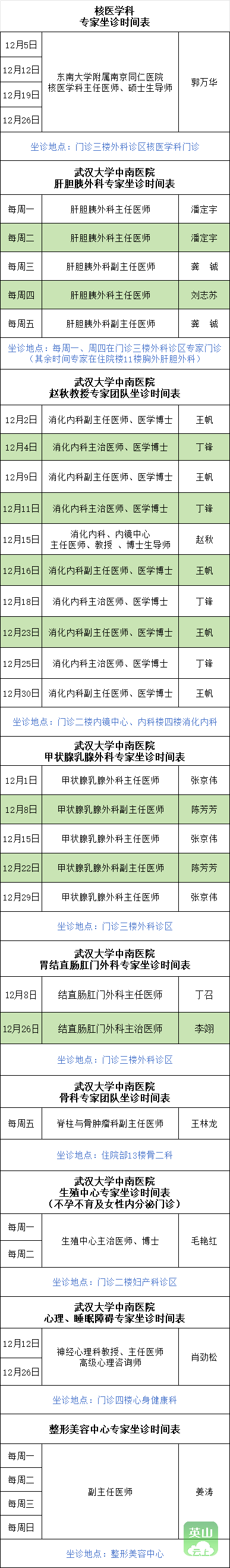 武汉大学中南医院、东南大学附属南京同仁医院等多学科专家团队教授在英山县医共体总医院(县人民医院)定期坐诊,近期具体坐诊时间安排如下: