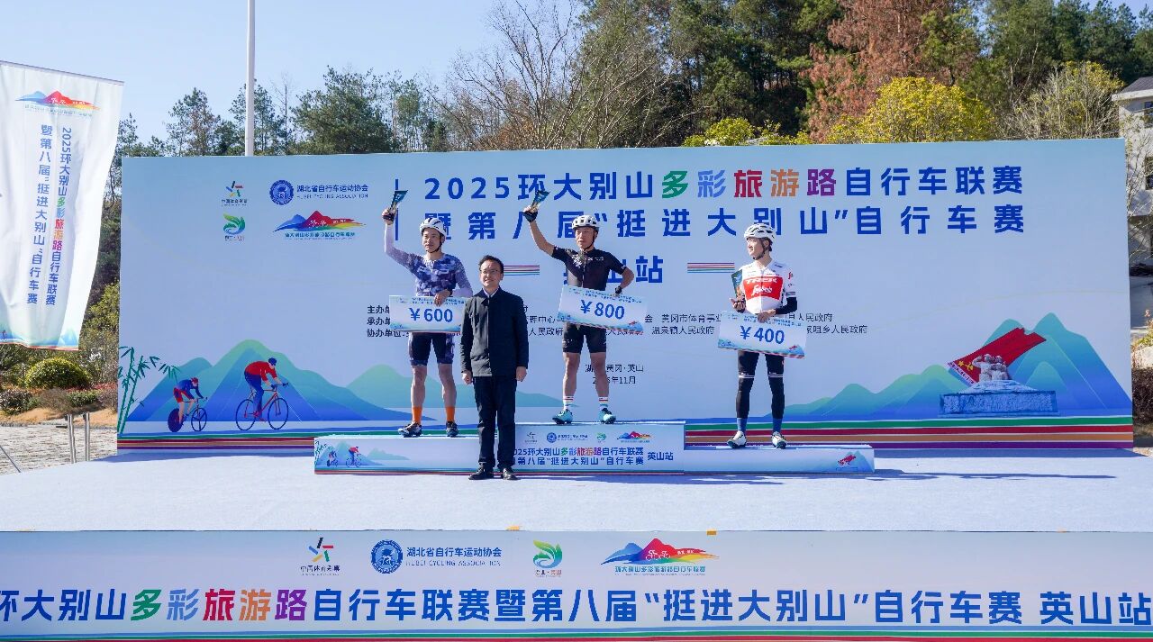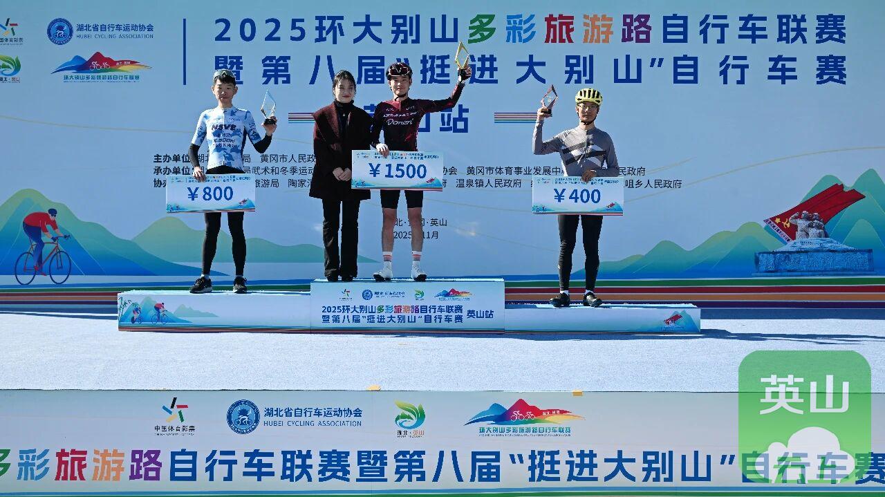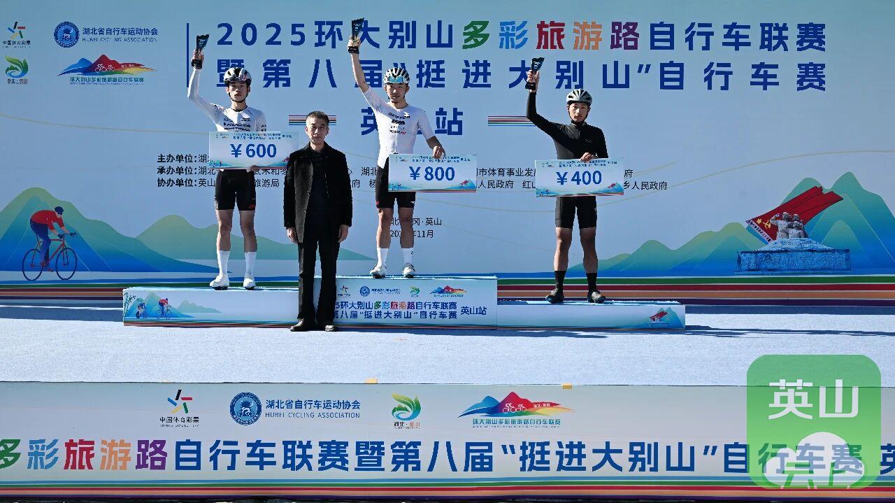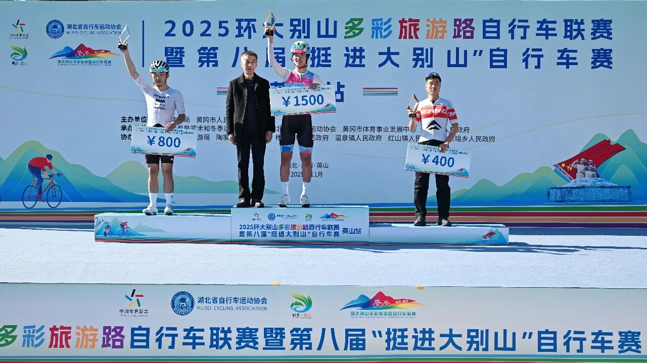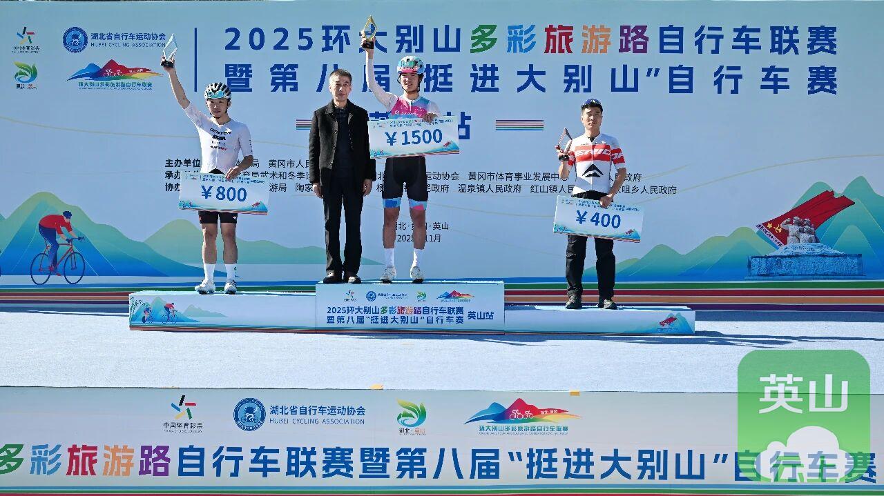 英山站比赛是2025环大别山多彩旅游路自行车联赛的收官之战,最终经过激烈角逐,五个组别分别决出前三名,并在闭幕式上进行了颁奖。