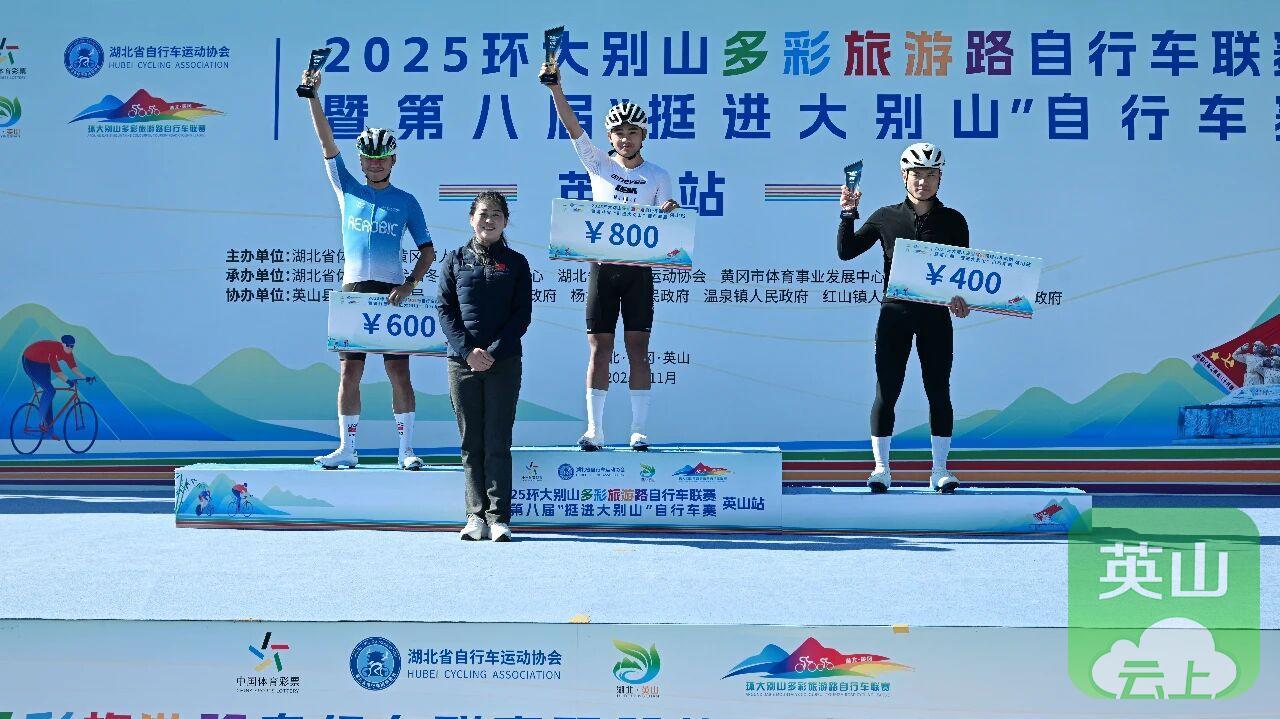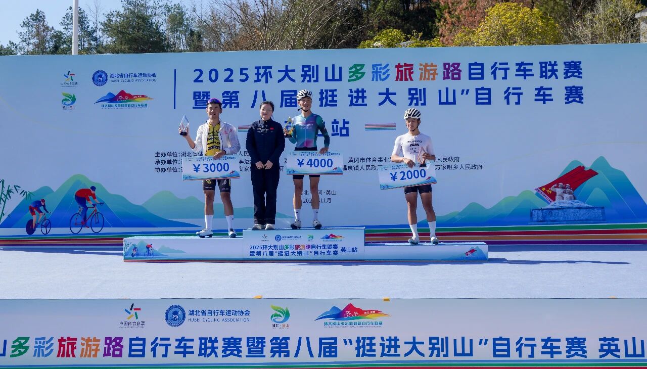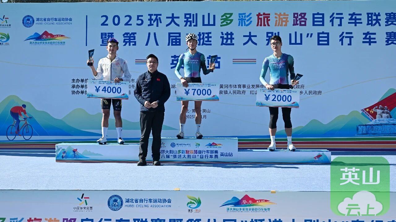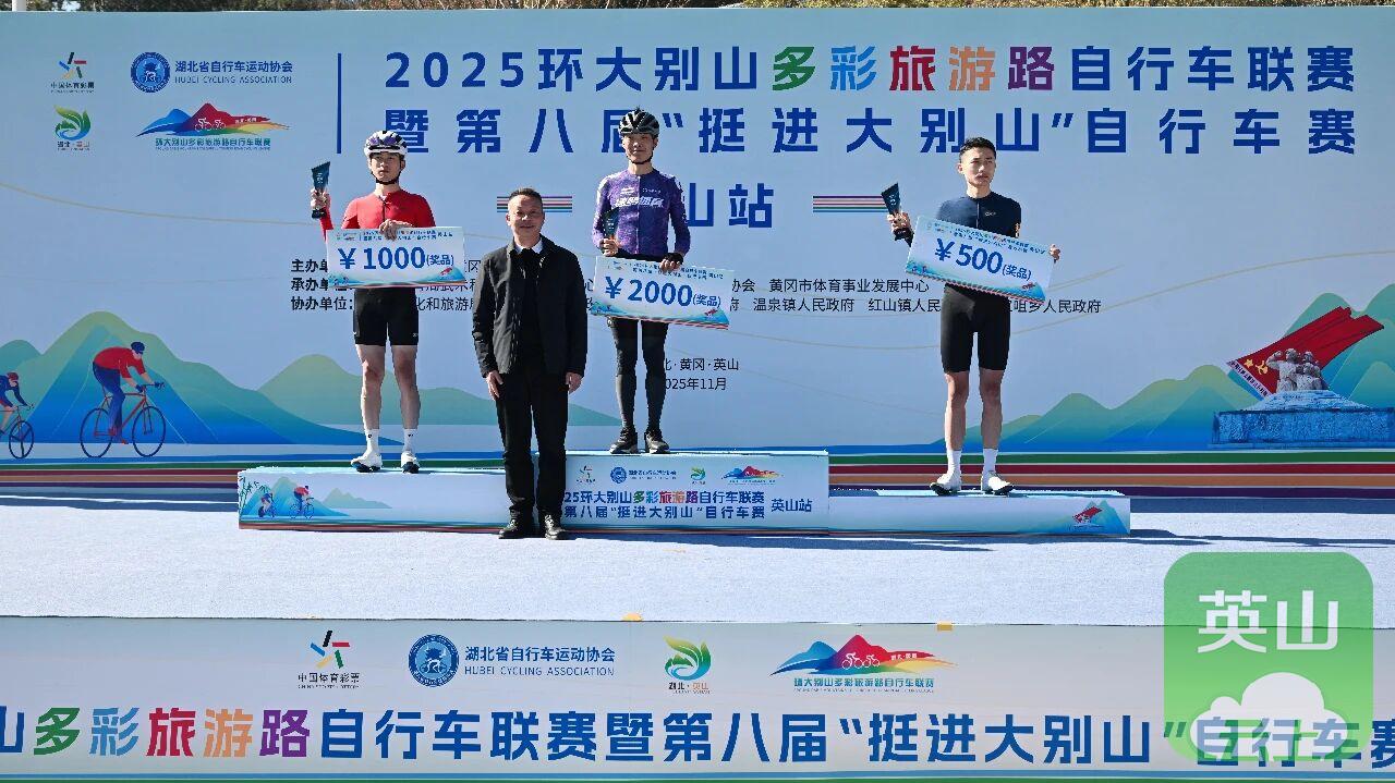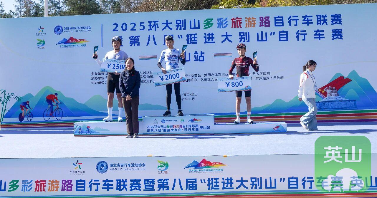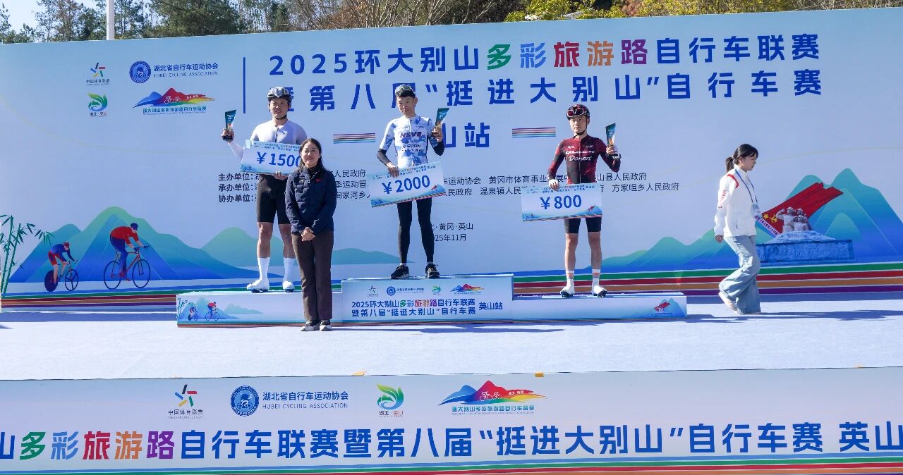 英山站比赛是2025环大别山多彩旅游路自行车联赛的收官之战,最终经过激烈角逐,五个组别分别决出前三名,并在闭幕式上进行了颁奖。