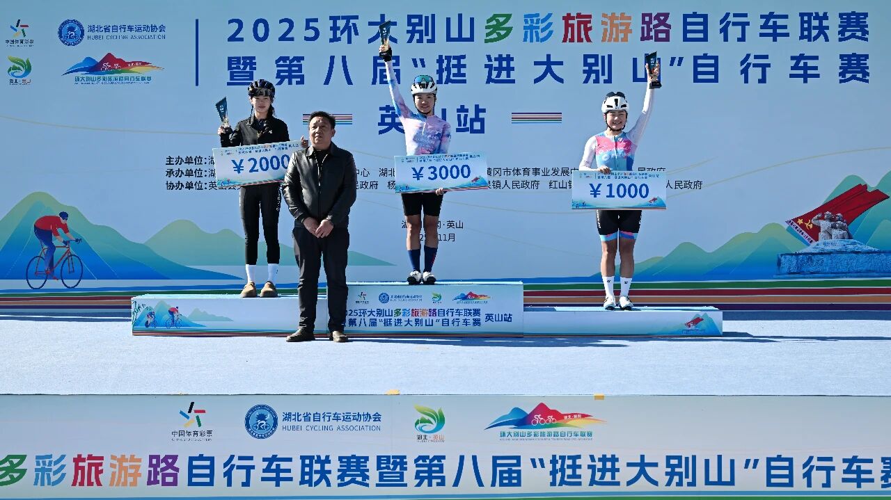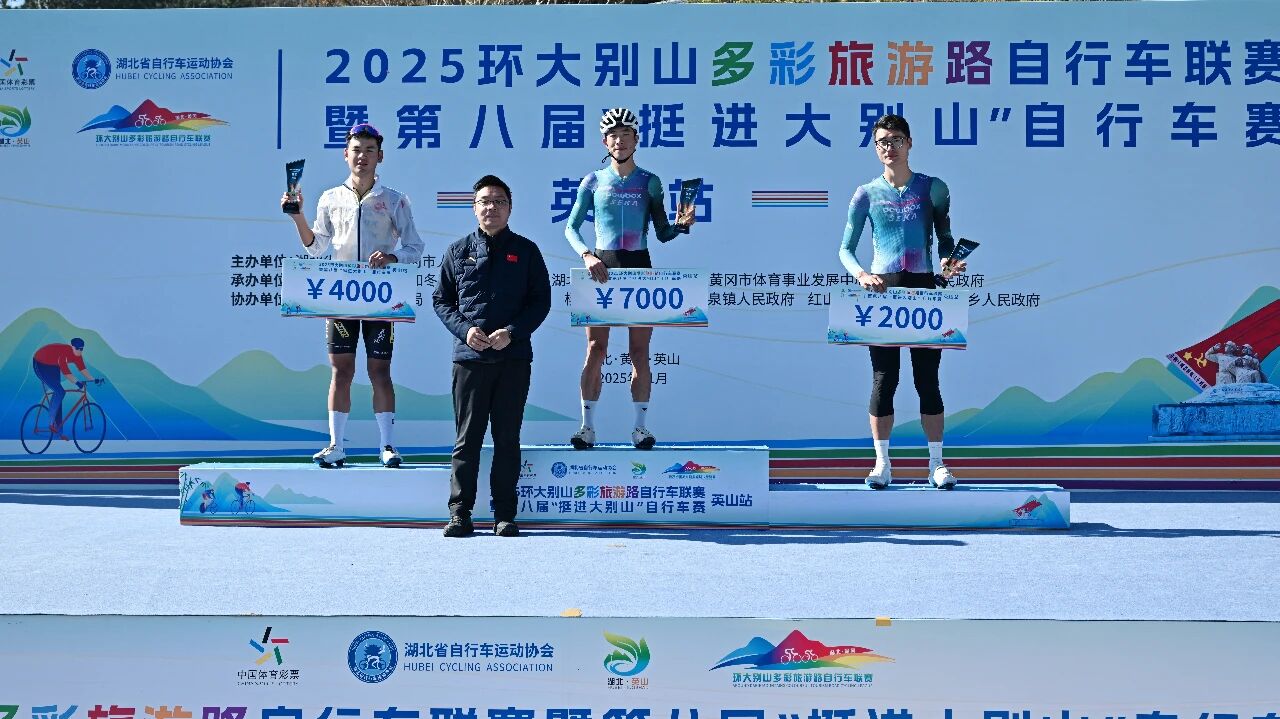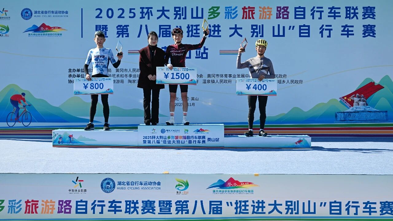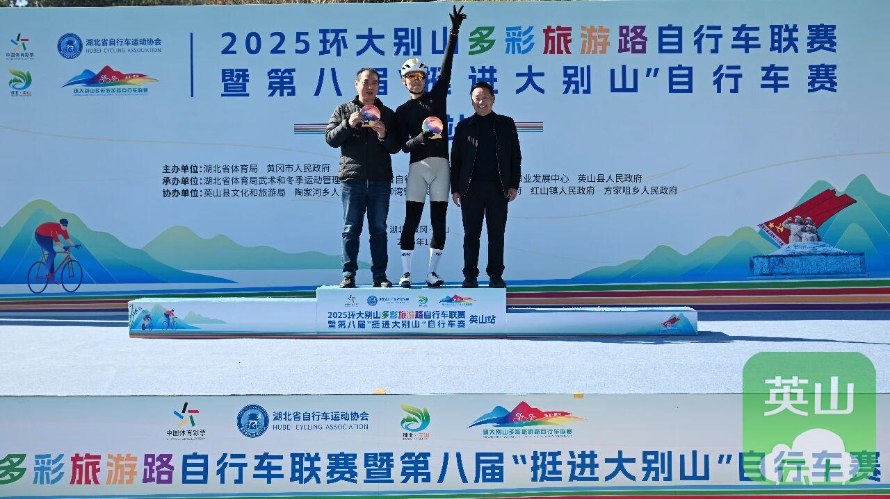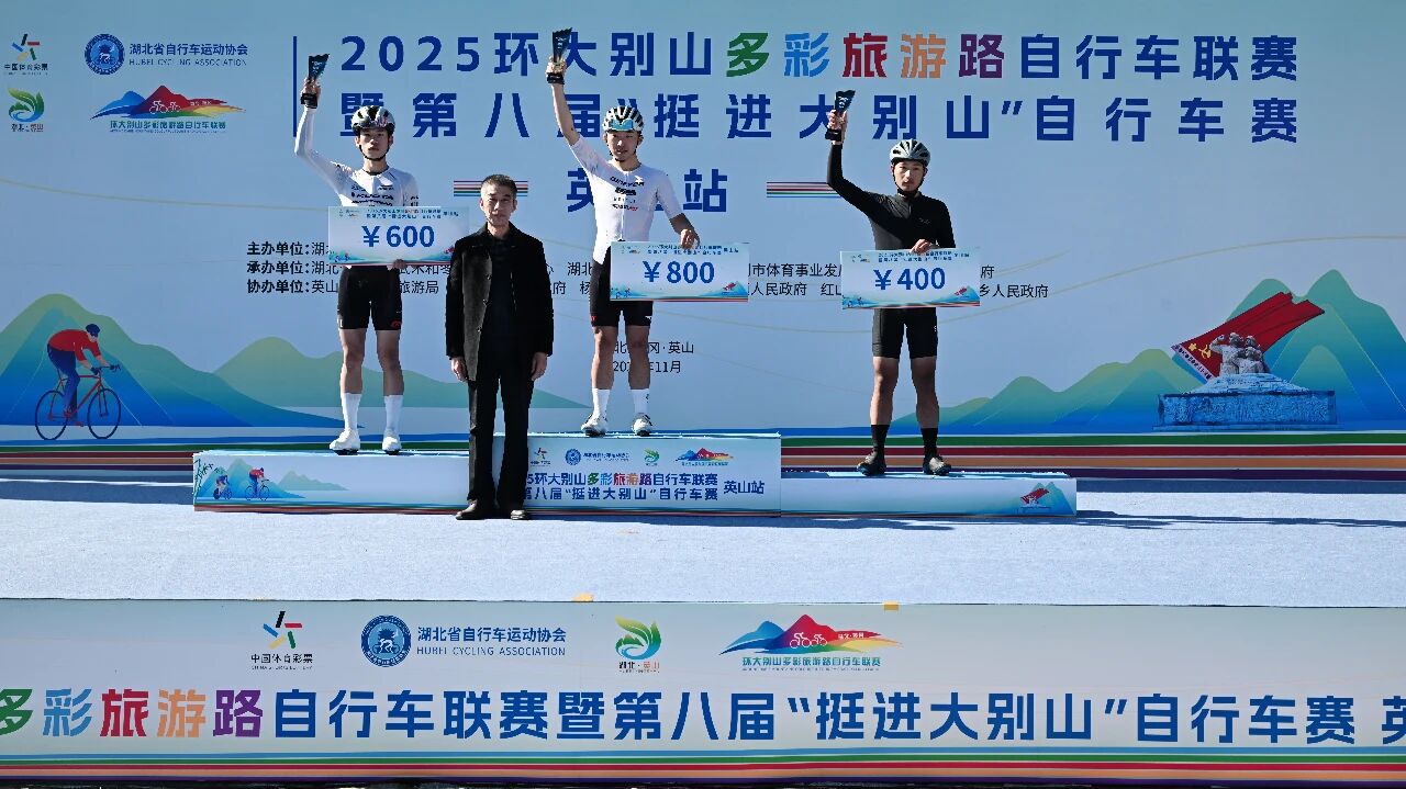 英山站比赛是2025环大别山多彩旅游路自行车联赛的收官之战,最终经过激烈角逐,五个组别分别决出前三名,并在闭幕式上进行了颁奖。