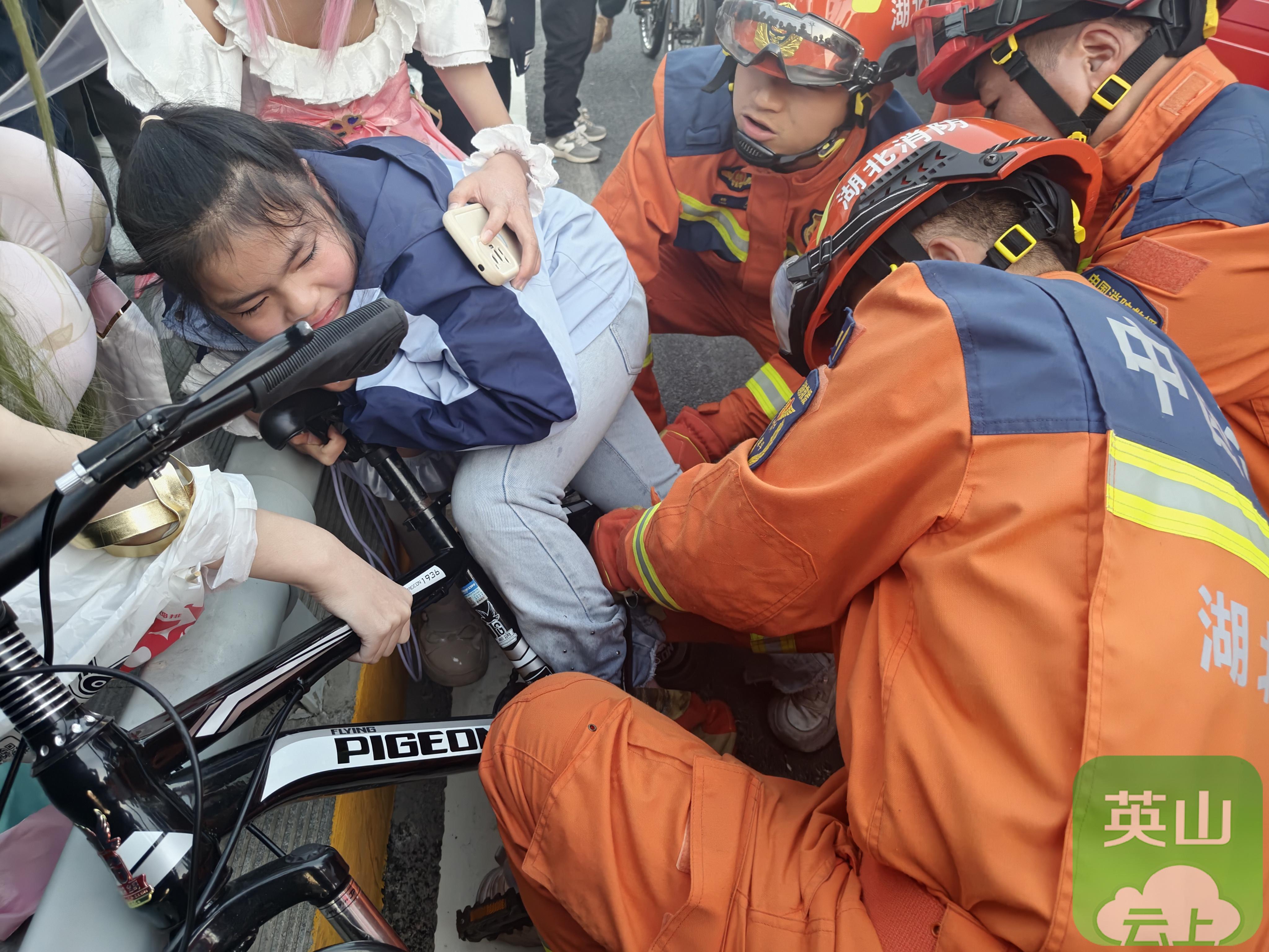 12月7日,黄冈市英山县莲花路街头,一名小女孩骑行时不慎将脚卡入自行车车架与踏板的缝隙中,疼得不停哭泣,周围群众见状急忙报警求助。