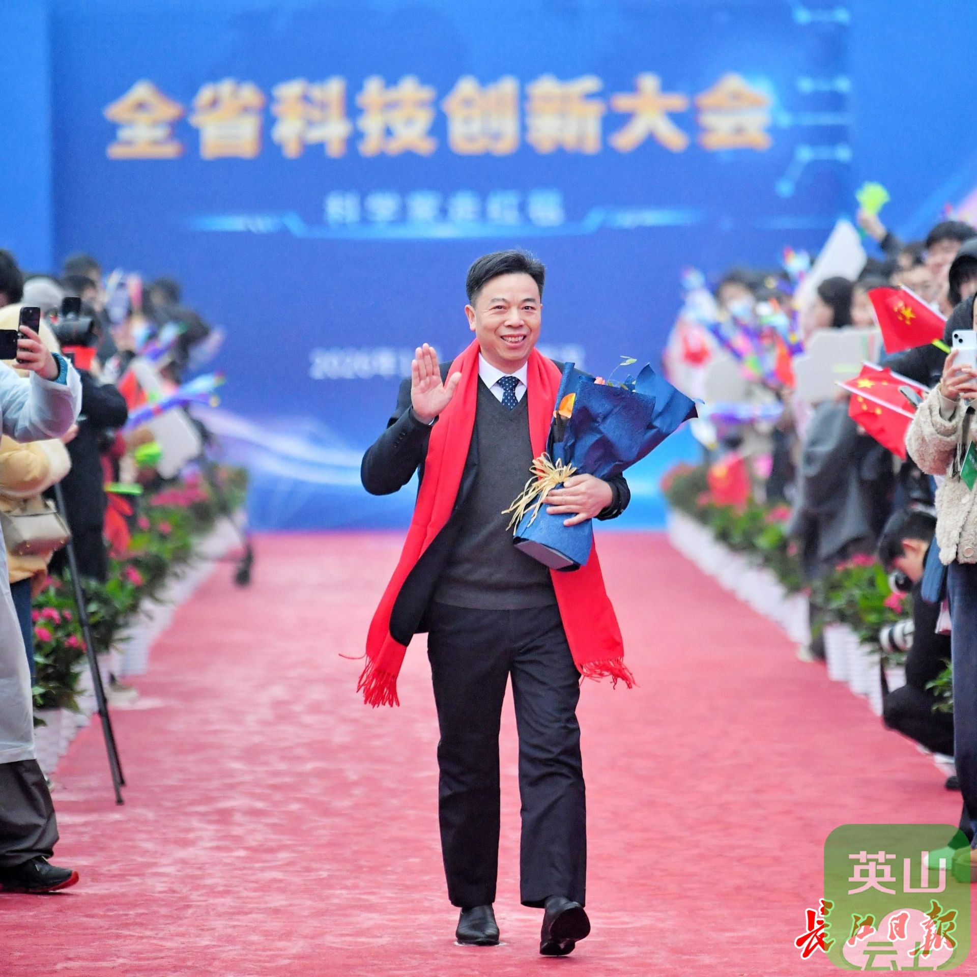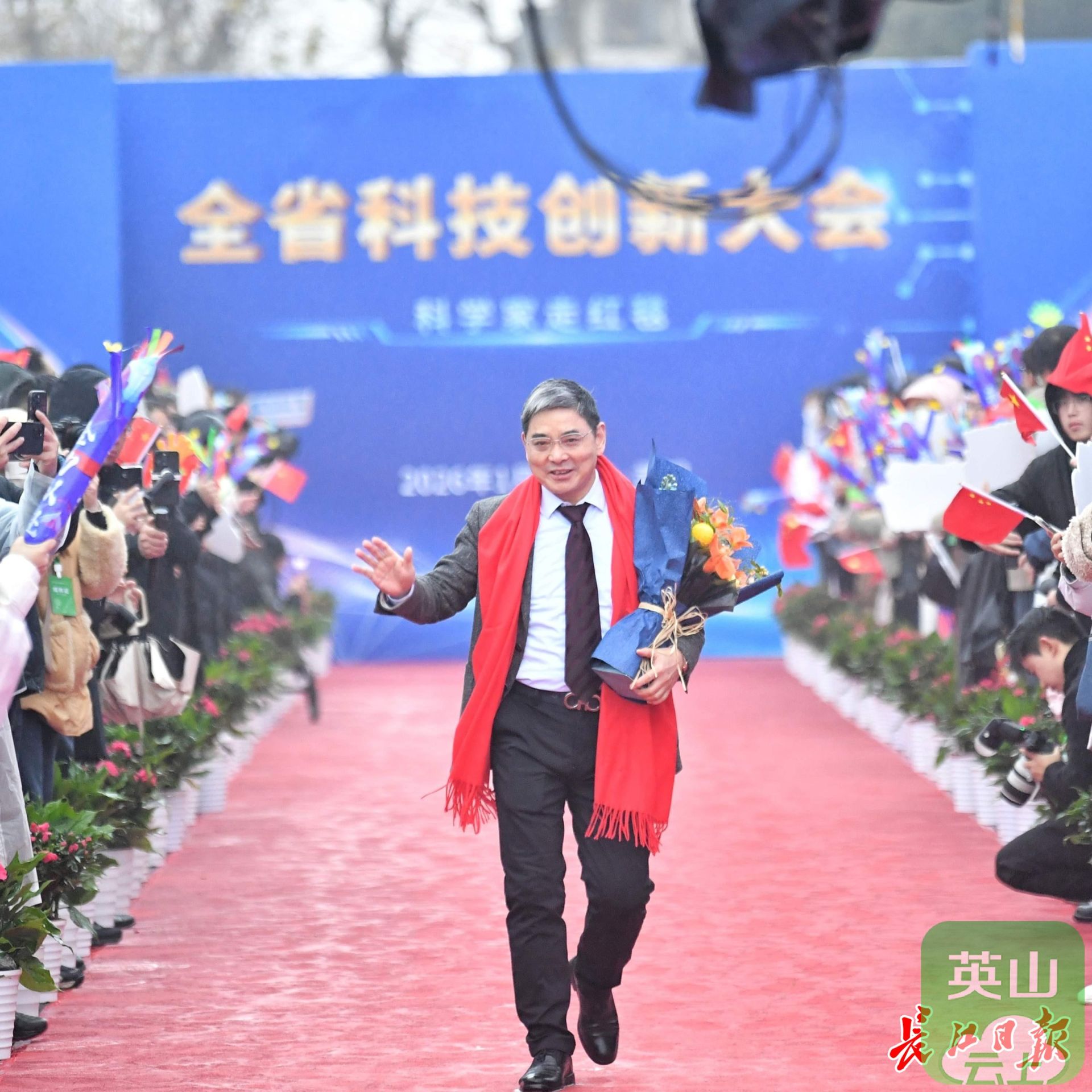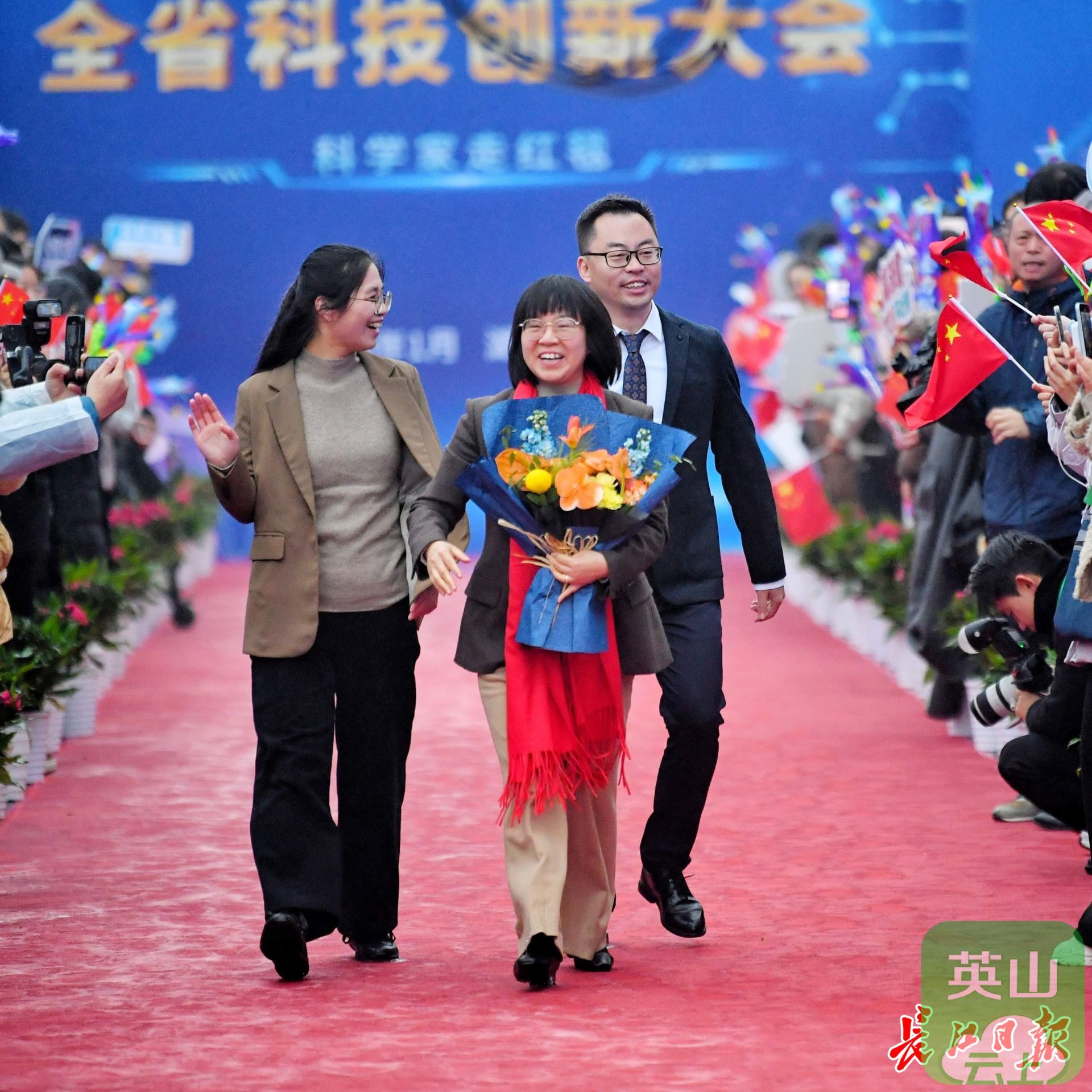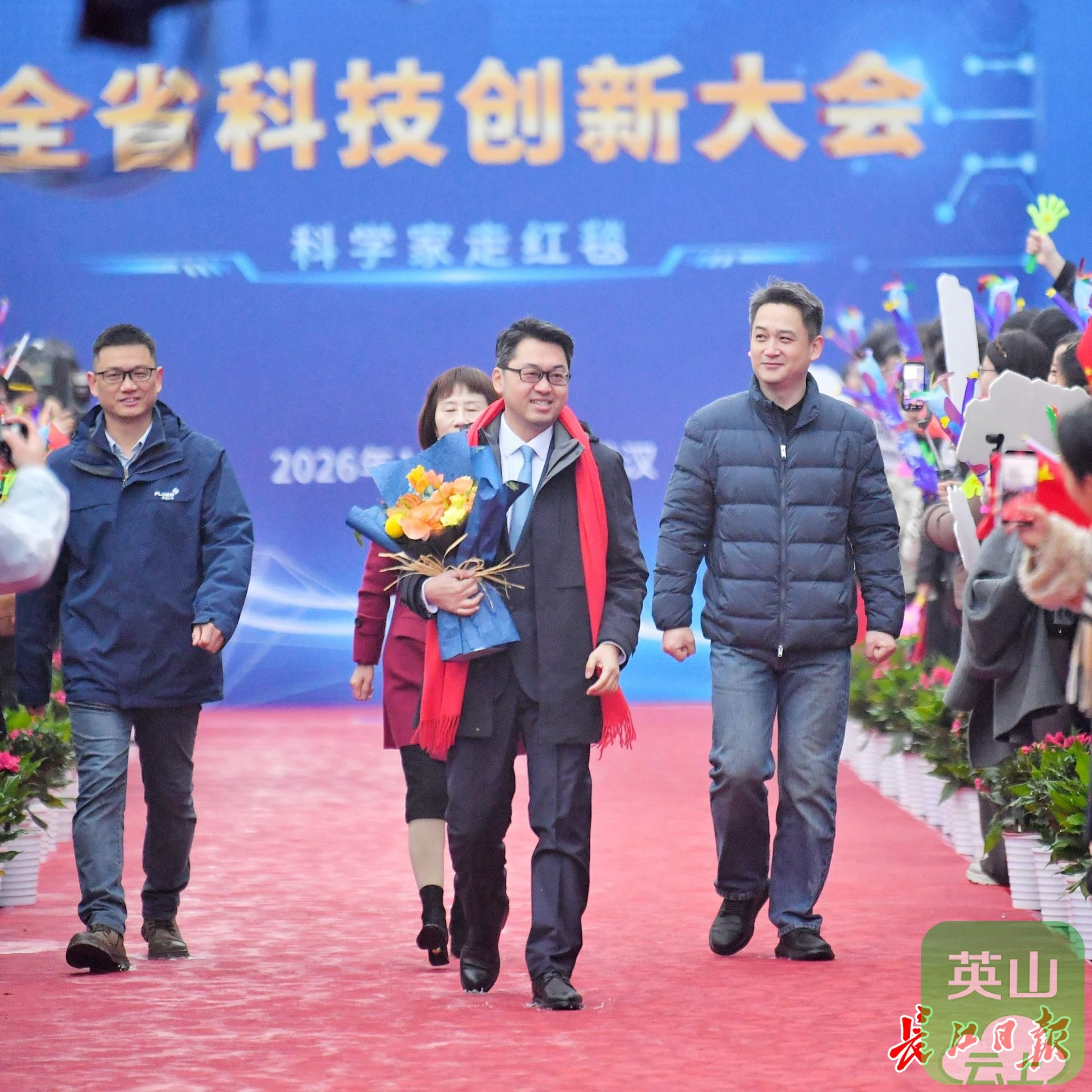 华中农业大学教授,2025年度湖北省青年科学创新奖获得者高泽霞(持花束者)走上红毯。