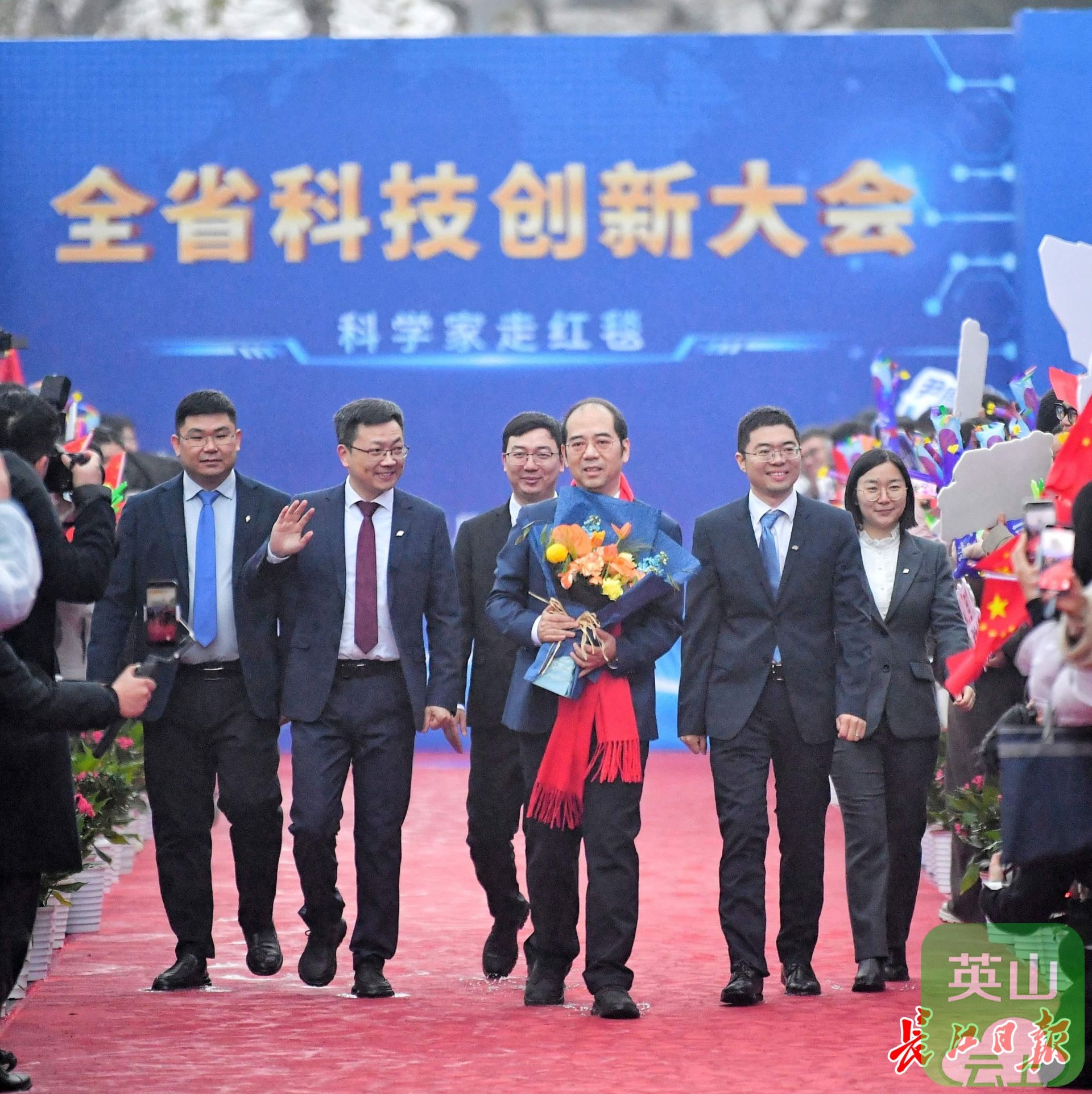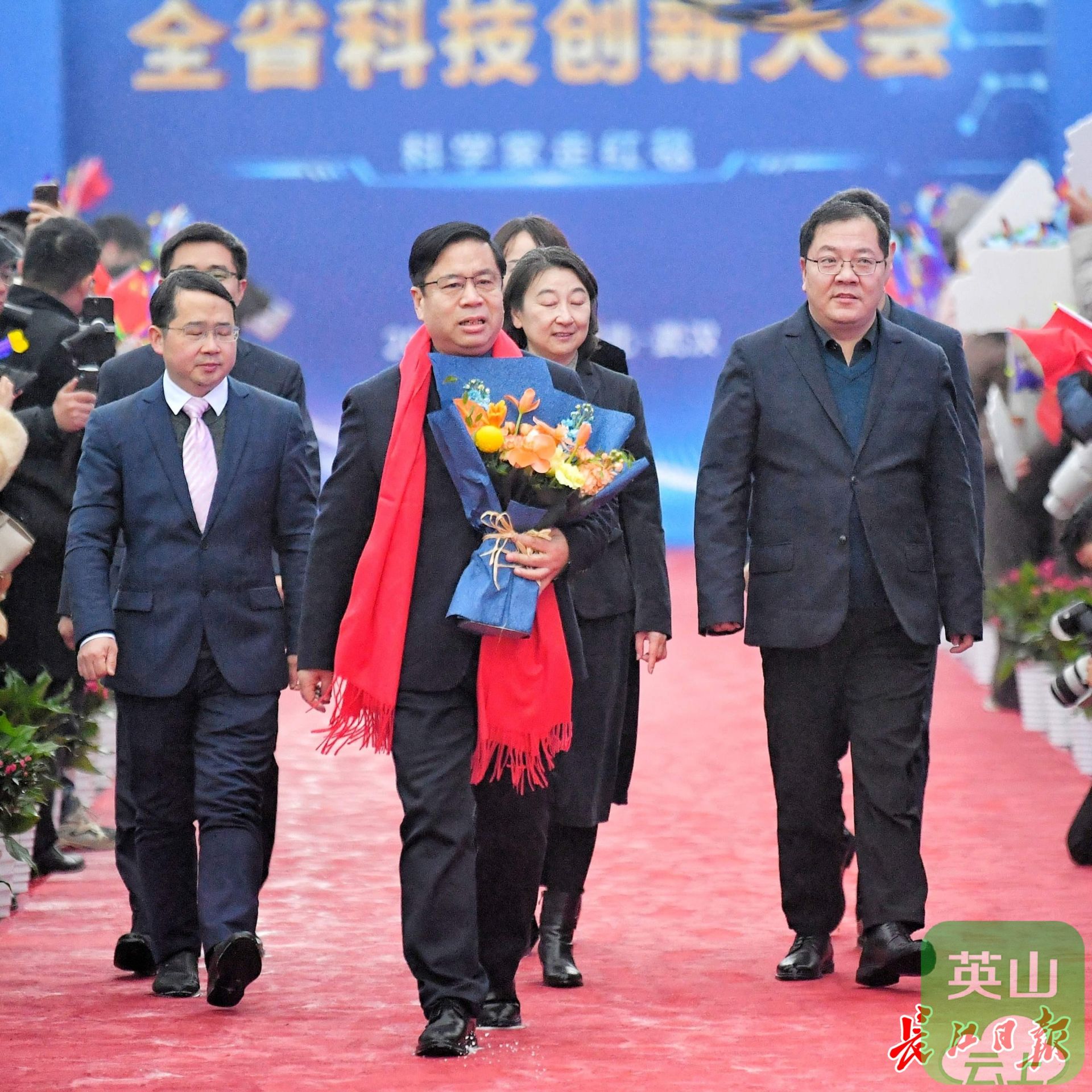 华中科技大学丁烈云院士(持花束者)走上红毯。