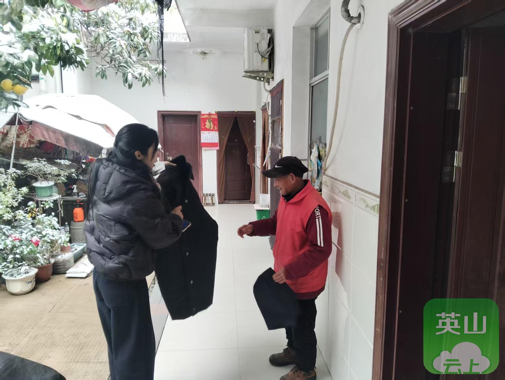1月20日,为应对低温雨雪天气,温泉镇蔬菜村驻村工作队与村“两委”干部开展“敲门送暖”行动。 工作人员上门为低保户、独居老人等重点家庭送上御寒棉服,检查住房与取暖安全,并叮嘱他们注意用火用电安全,保持通风,防范一氧化碳中毒。
