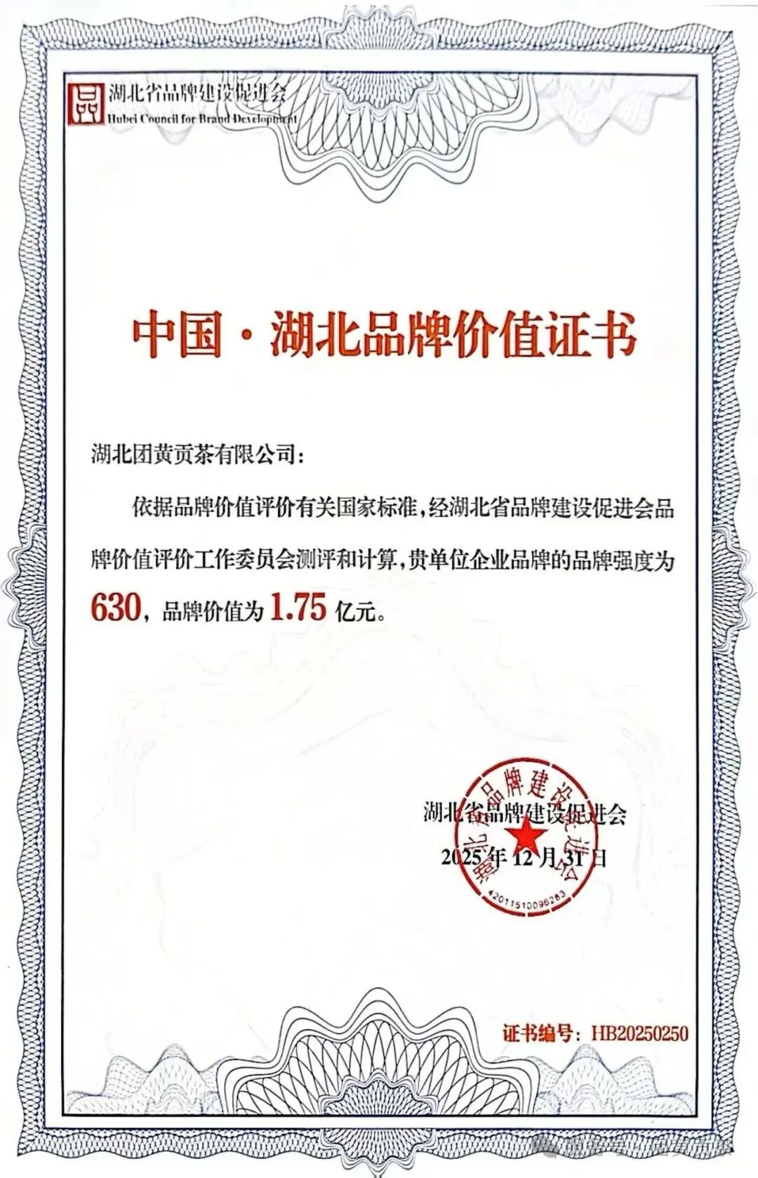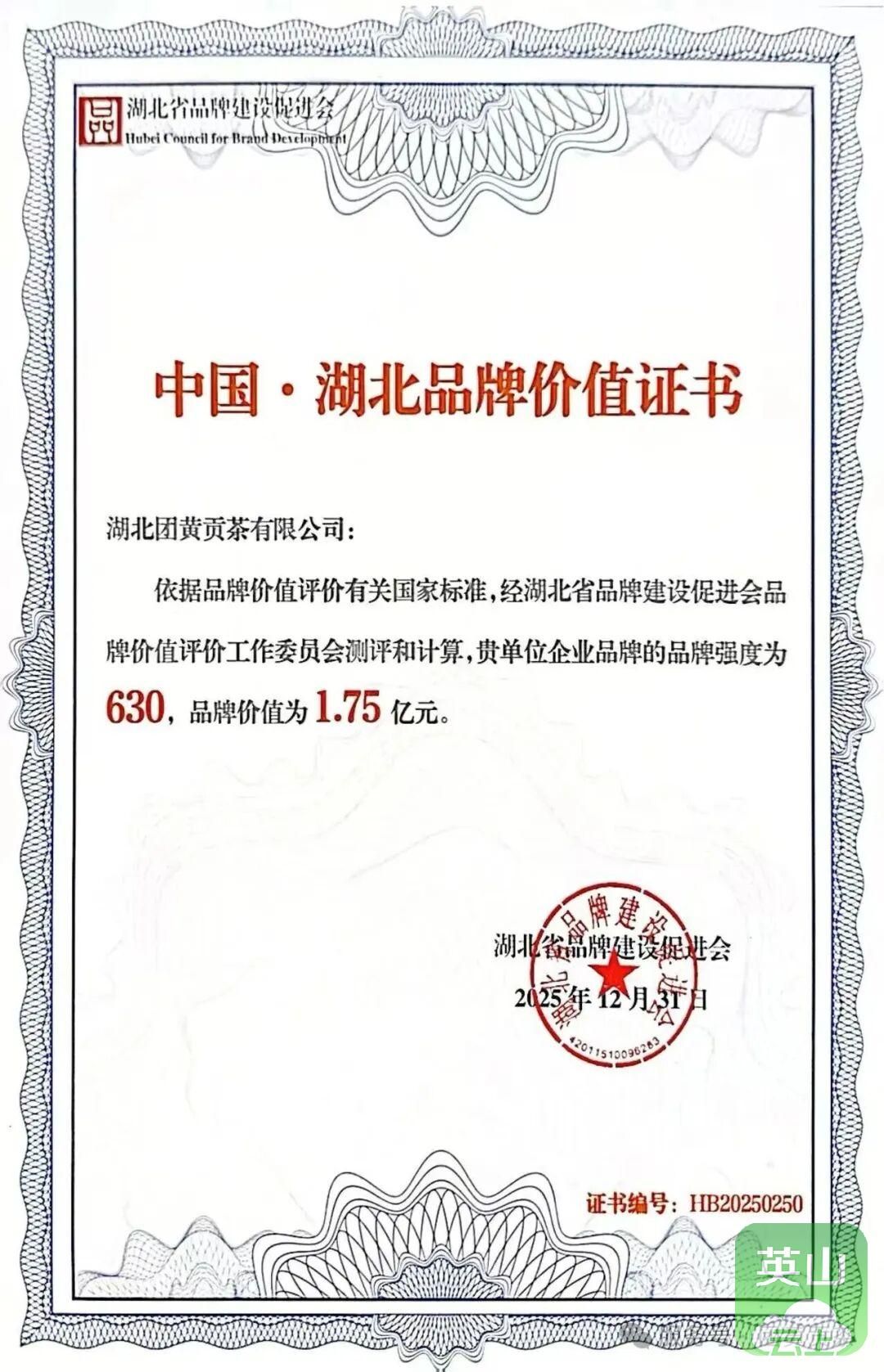 会议正式发布了2025年湖北品牌价值评价结果,团黄贡茶凭借深厚的品牌积淀与过硬的产品品质荣获由湖北省品牌建设促进会颁发的《中国·湖北品牌价值证书》。经权威测评,公司品牌强度630,品牌价值达1.75亿元,彰显了其在湖北茶产业及区域品牌“英山云雾茶”中的核心竞争力。
