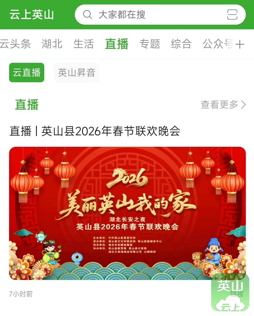 1.进入直播间:下载安装“云上英山”客户端或英山融媒微信公众号分享的链接观看直播;