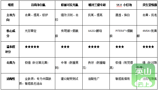 分析结论:在“去黄”与“淡斑”的博弈中,修丽可和SK-II更倾向于解决黑色素的存量问题(淡斑/美白),而谷雨和资生堂则更侧重于解决肤色的增量问题(去黄/改善气色)。