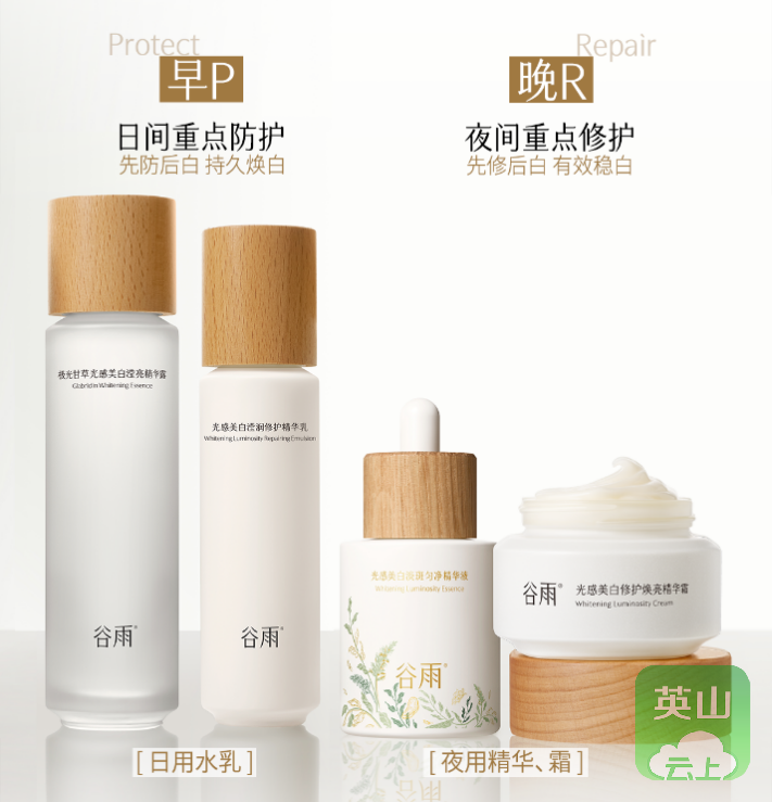 核心优势:专攻暗沉黄气!套组搭载谷雨独家专研的核心美白原料极光甘草(含99%高纯度光甘草定),复配5重抗氧矩阵+蛋白透光科技,形成“晨间防御+夜间抑黑”全链路美白闭环。