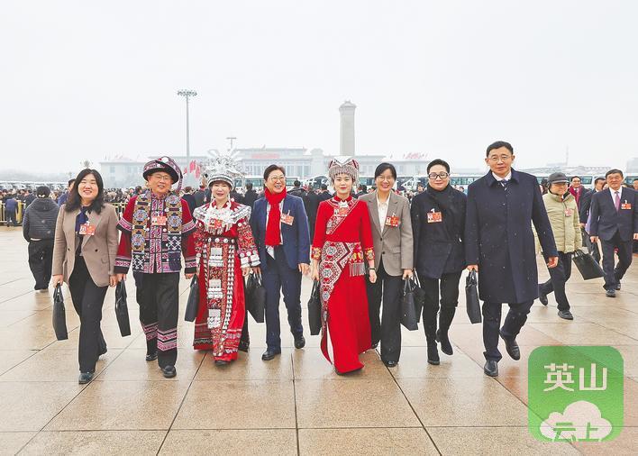 3月5日,十四届全国人大四次会议开幕会前,湖北代表团代表意气风发步入会场。(湖北日报全媒记者 张朋 蔡俊 摄)