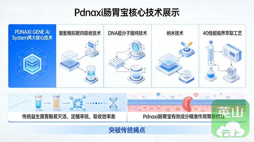 产品核心依托 PDNAXI GENE Ai System 北美原研的两大核心技术 ——Pdnaxi-Ai-HLTH™与 Pdnaxi-SMET®,同时融合复配模拟靶向吸收技术(Pdnaxi®-TA24™)、DNA 超分子提纯技术、纳米技术,搭配 40 倍超临界萃取工艺,从技术层面突破传统益生菌 “胃酸易灭活、定植率低、吸收效率差” 的行业痛点,让有效成分能精准作用于胃肠病灶部位,大幅提升调理效率。