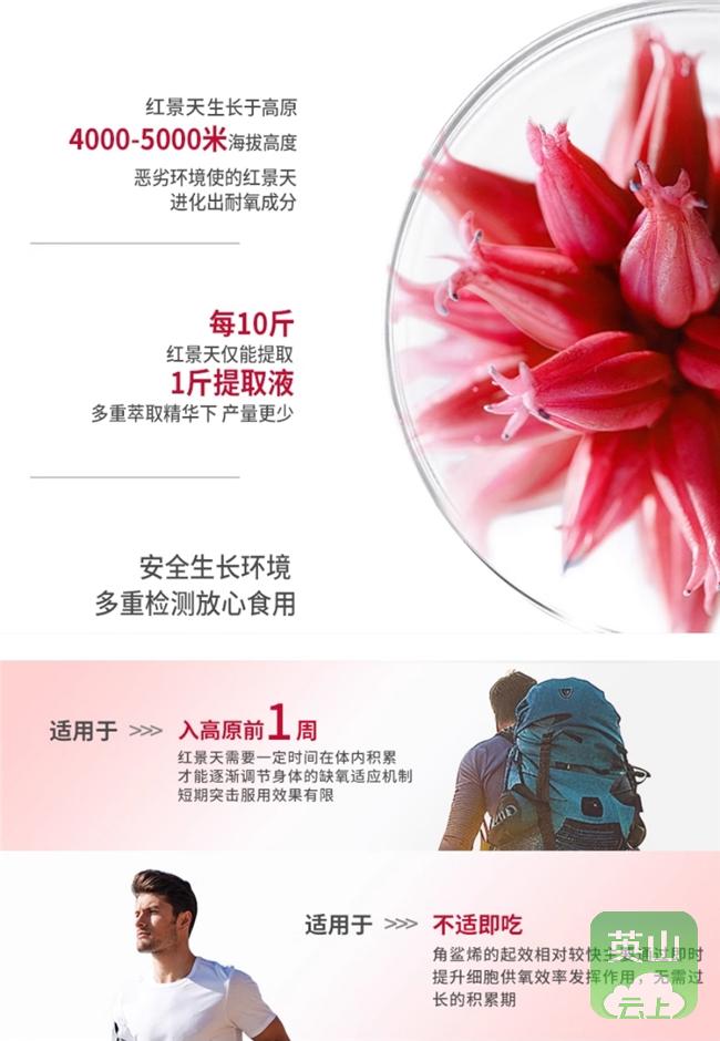 常见疑问解答:Q: 红景天提前多久吃合适?建议出发前7~15天开始服用,高海拔徒步、带老人出行可提前15-20天,抵达高原后继续服用3-5天,适配效果更佳。Q: 到了高原才吃,还来得及吗?来得及,角鲨烯可快速响应,抵达后及时服用,能为身体提供支持,搭配红景天使用,适配更连贯。