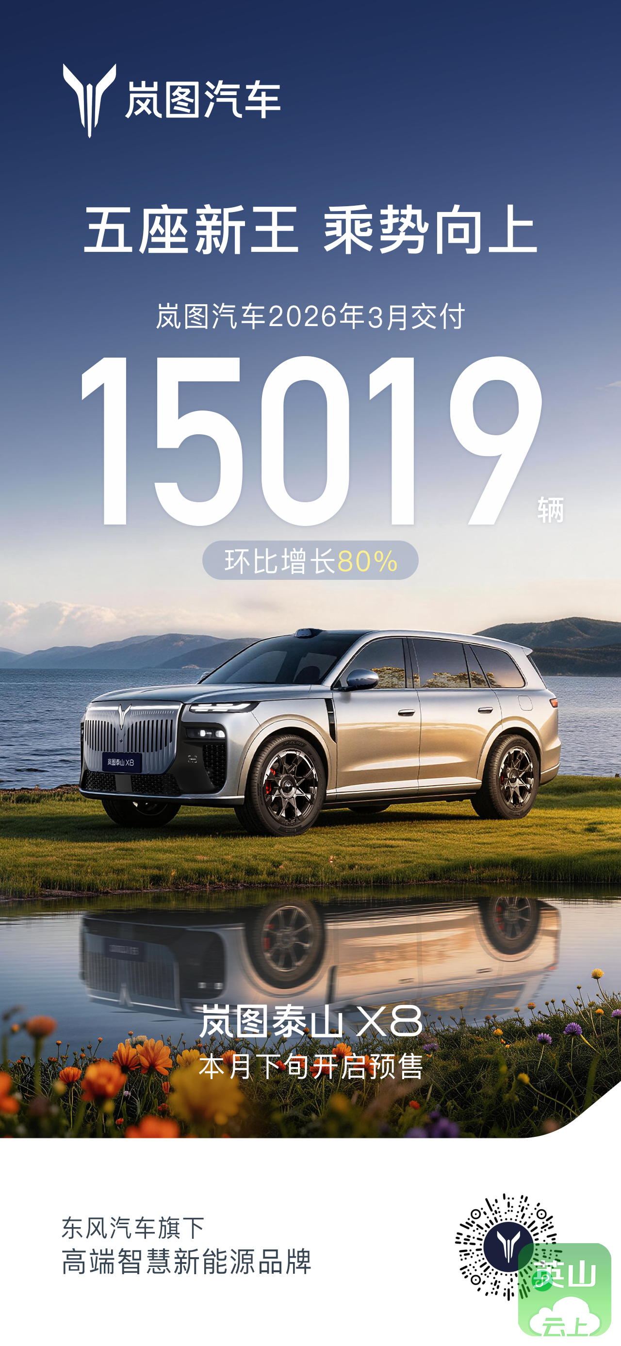 产品端,密集上新。3月,从高端MPV到SUV,岚图几乎以“周更”的节奏推进产品:梦想家第20万辆下线、泰山Ultra量产交付、“五座新王”泰山X8首发亮相——其中,泰山X8尚未开启预售,已经在市场端积累起不低热度。
