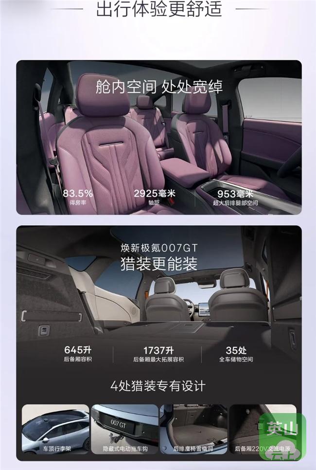 焕新极氪007GT后备厢标准容积645L,最大可扩展至1737L,全车35处储物空间,支持车顶行李架(载重150kg)及智能电动拖车钩(水平拖挂1.6吨),后排扶手处设有雪板通道,并标配220V电源插座。