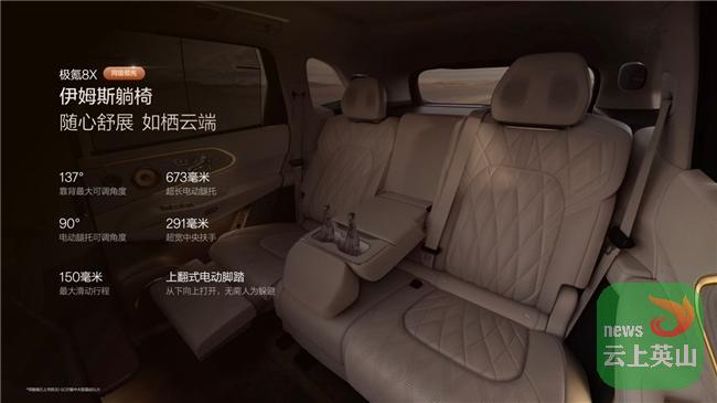 对于商务接待高端SUV的使用场景,后排体验往往是决定性因素。极氪8X作为旗舰大五座,二排右侧配备137°黄金躺角伊姆斯躺椅,配合17英寸后排吸顶屏、16英寸双联屏(Ultra版起标配),以及29扬声器的Naim殿堂之声音响,让接待过程变成移动的私人音乐会。同时,极氪8X可选装六座(选装价1万元),进一步拓展了多场景接待能力。