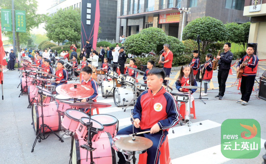 阳光小学的学生们用激昂的鼓点声为跑者加油。