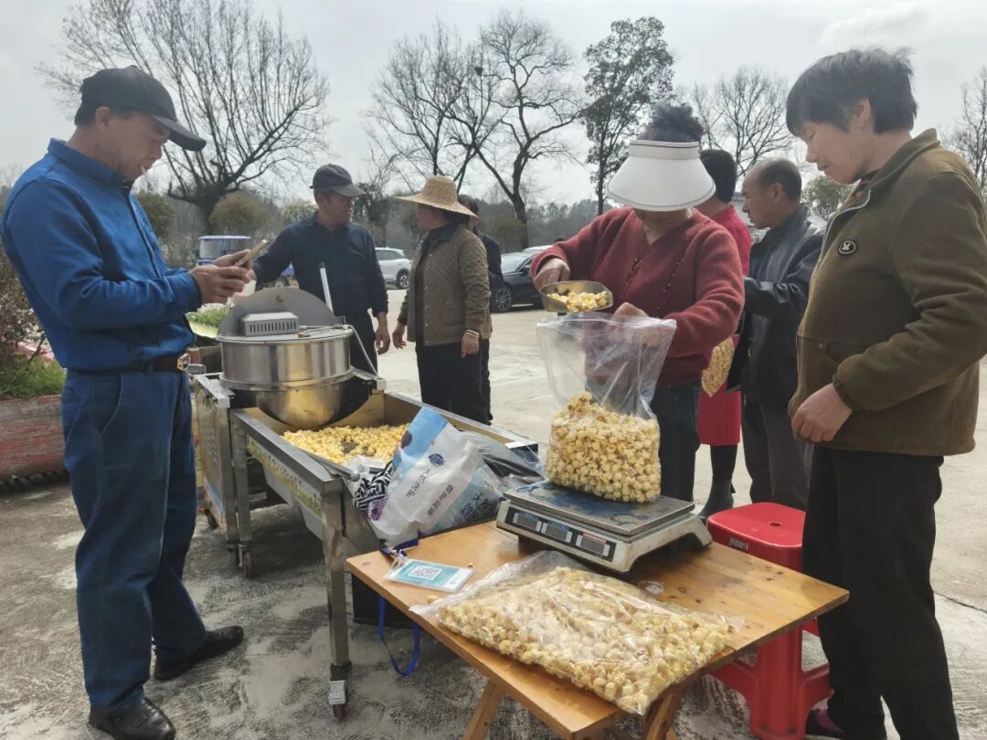 活动现场暖意融融,烟火气与戏曲声交织在一起。还有村民趁着热闹摆起了爆米花小摊,现炸的爆米花香气四溢,引得看戏的村民纷纷驻足购买,一下午营业额就有大几百元。她笑着说:“听说县黄梅戏剧团来演出,周边几个村的乡亲都赶过来了,我这摆摊也能卖点东西。听说这场活动要搞三天,我准备天天都来,能做点小生意,还能一边看戏一边听新风,两头都就着了!”